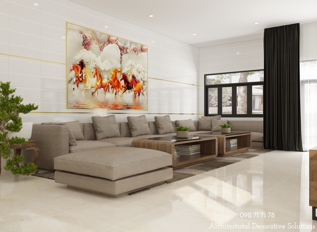 Phòng khách ấn tượng bởi sự sang trọng, khoa học với bộ sofa chữ L kích thước lớn, bàn trà mặt kính cao cấp, kệ tivi gỗ đơn giản mà hiện đại và điểm nhấn nổi bật với tranh treo tường vô cùng độc đáo.