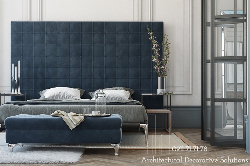 Một đầu giường lớn bọc trong màu xanh khói mang lại sự sống cho các tông màu xám lạnh sử dụng trong suốt phòng. Đặc biệt đáng chú ý là màu sắc trung tính của gỗ mang lại không khí tự nhiên lan tỏa khắp phòng.