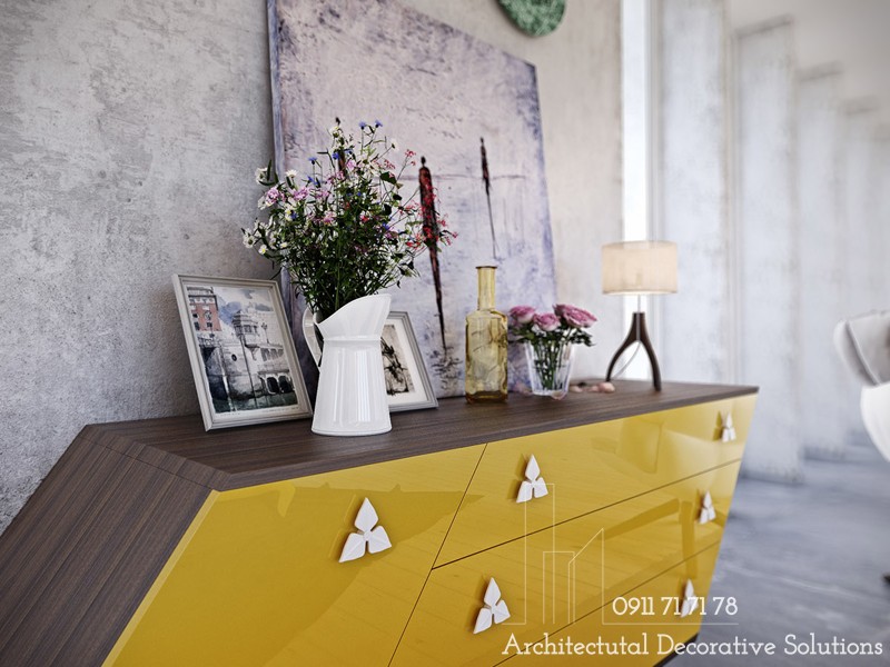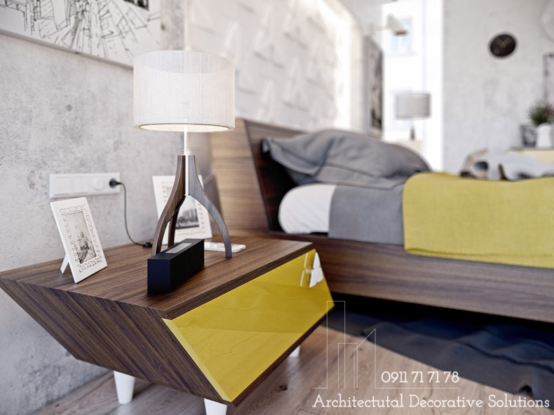 Những chiếc ngăn kéo màu vàng nổi bật được trang trí thêm những tay cầm kiểu hình cánh hoa màu trắng tạo nên điểm sáng và sang trọng hơn cho không gian phòng ngủ.