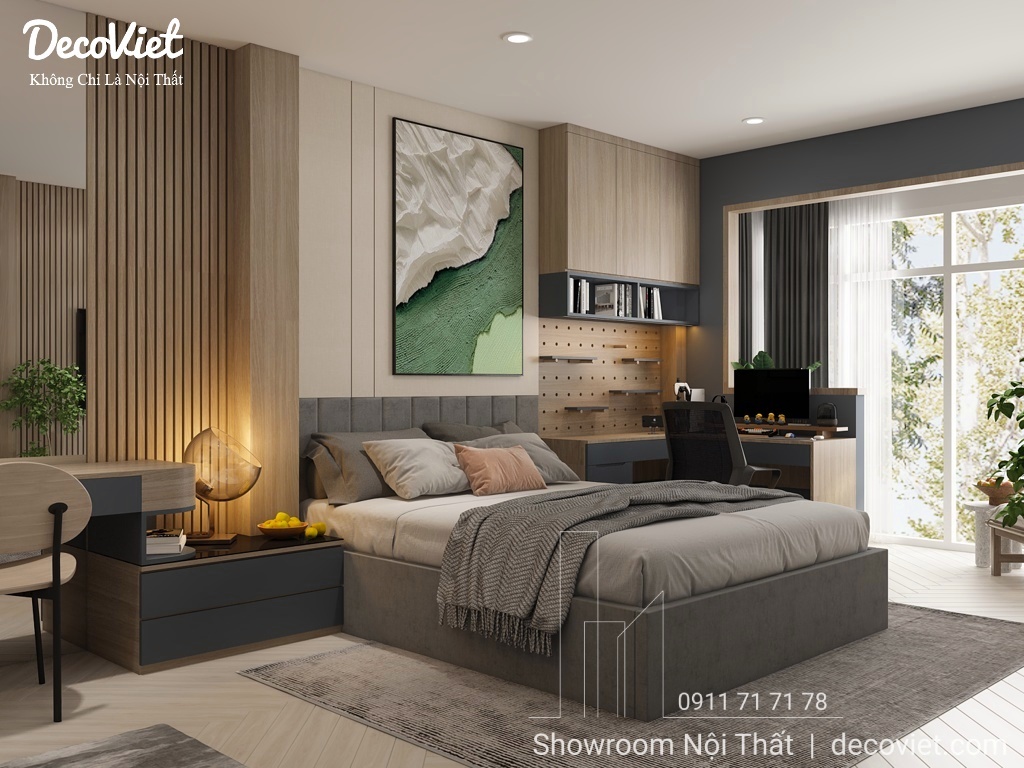 Một giấc ngủ tốt hay không còn phụ thuộc vào việc lựa chọn giường ngủ như thế nào. Phòng ngủ master khá rộng nên Nhà Decor đã lựa chọn giường ngủ lớn để tạo sự thoải mái khi nghỉ ngơi. Giường ngủ giá rẻ hiện đại với chất lượng cao cấp sẽ mang lại sử thoải mái và an toàn cho chủ nhân căn phòng, bên cạnh đó sẽ giúp căn phòng trở nên thẩm mỹ, ấm cúng và thân thuộc hơn.