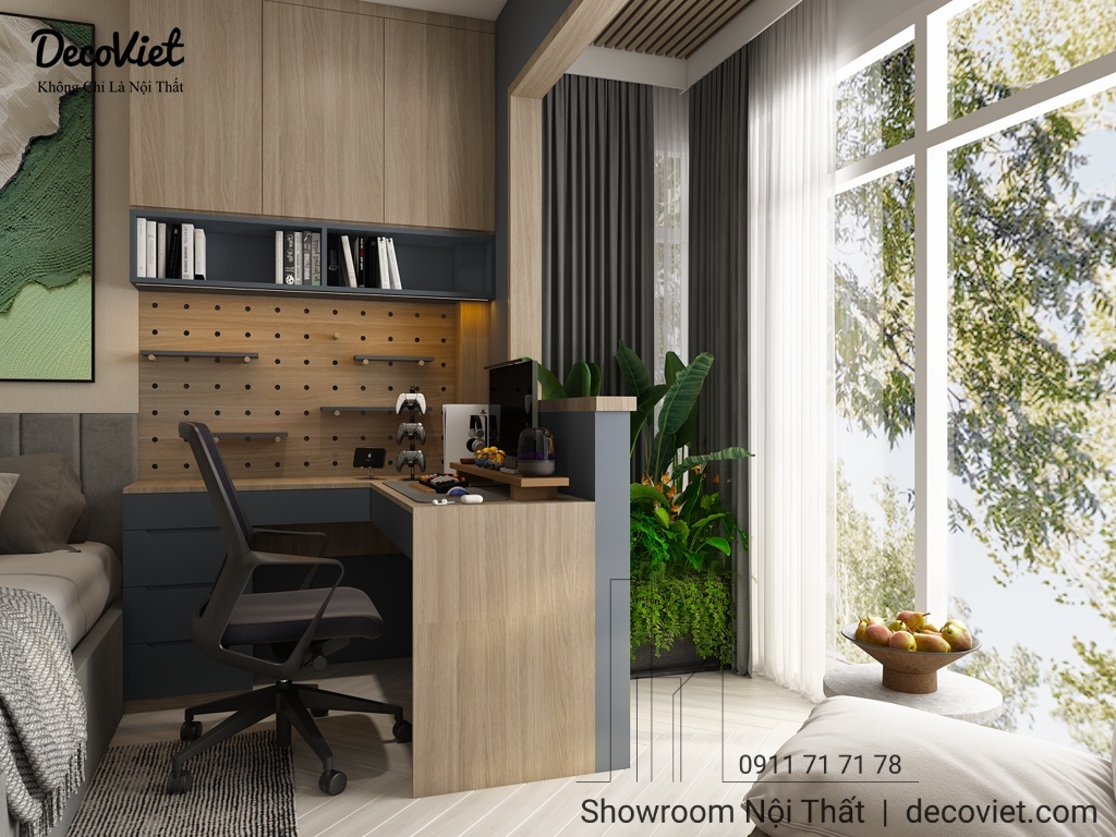 Bởi gia chủ có tính chất công việc đặc thù, luôn bận rộn và bắt buộc phải làm việc thêm tại nhà sau giờ làm thì việc bố trí một nơi để tập trung làm việc là điều rất cần thiết. Bàn làm việc và nơi nghỉ ngơi được tích hợp vào trong cùng một không gian, đó chính là giải pháp hiệu quả giúp tiết kiệm diện tích nhưng vẫn thuận lợi trong việc di chuyển, sinh hoạt của gia chủ.