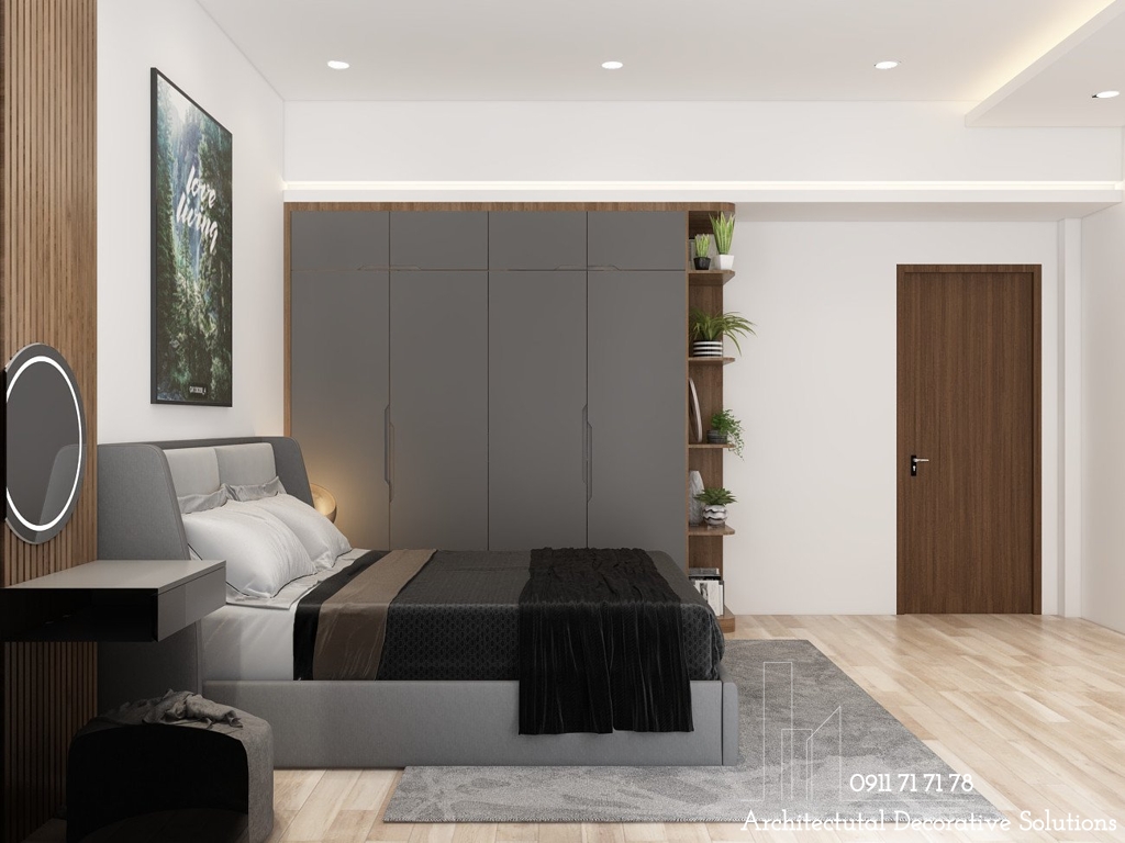 Thiết kế thi công nội thất căn hộ 2 phòng ngủ trọn gói - Với thiết kế nhẹ nhàng không quá cầu kì tạo nên sự thuần khiết. Tủ quần áo đụng trần tích hợp kệ hở trang trí sang trọng. Một chiếc giường khá lớn được kê chính giữa phòng. Bàn trang điểm được thiết kế hướng ra cửa sổ ngay cạnh.