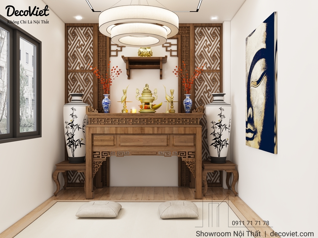 Thờ cúng ông bà tổ tiên thể hiện sự biết ơn và sự tưởng nhớ của con cháu đối với những người đã khuất. Phòng thờ gia tiên sử dụng chất liệu nội thất gỗ tự nhiên với các đường nét chạm trổ theo phong thuỷ mang đậm nét văn hoá truyền thống của người Việt.