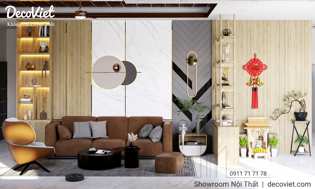 Một trong những cách để làm nổi bật phòng khách chính là sự tương phản của thiết kế nội thất. Sự tưởng phản của bức tường ốp gỗ giả đá màu trắng cùng với ghế sofa màu nâu làm nổi bật lên vẻ đẹp tinh tế, sang trọng và hiện đại. Đồng thời còn tạo cảm giác mới lạ, cuốn hút cho đôi mắt.