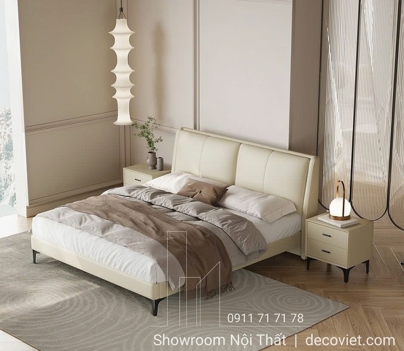 Giường bọc nệm màu kem sang trọng, thiết kế tối giản hiện đại