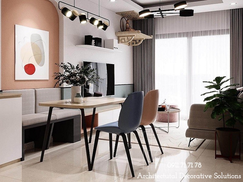 Sự kết hợp màu sắc sẽ tuân thủ theo quy tắc 60 – 30 – 10. Quy tắc này sẽ tuân thủ với 60% diện tích dành cho màu chủ đạo, là màu tường, trần,… 30% diện tích sẽ sử dụng màu sắc cho các đồ nội thất. Bởi vậy, bạn nên lựa chọn màu sắc điểm nhấn gây ấn tượng trong 30% này. Cuối cùng, 10% diện tích sẽ là màu sắc cho đồ trang trí nhỏ. Với 10% này, bạn có thể lựa chọn nhiều màu sắc để tạo thêm sự sinh động cho không gian.